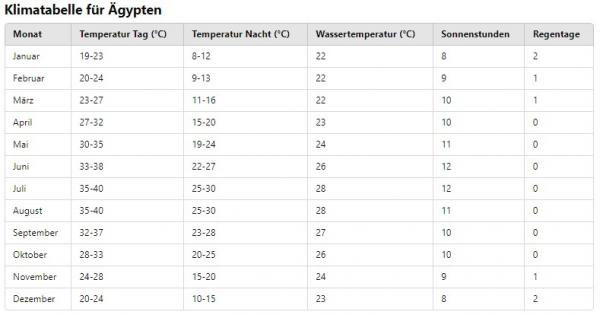 Ägypten hat ein trockenes Wüstenklima mit heißen Sommern und milden Wintern. Die Temperaturen variieren je nach Region: Während es in Kairo oder Luxor in den Sommermonaten über 40 °C heiß werden kann, sind die Küstenregionen am Roten Meer etwas angenehmer.