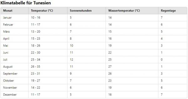 Klimatabelle für Tunesien - Sonnenstunden - Regentage - Wassertemperatur