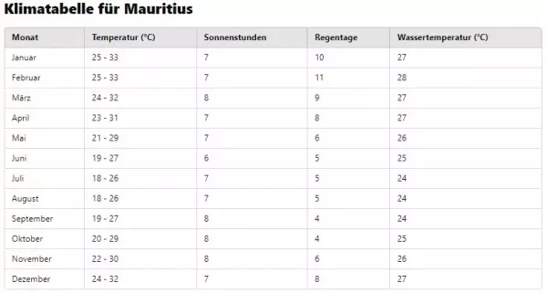 Mauritius: Mai bis Dezember – trocken, sonnig und warm (ca. 26–30°C), ideal für Strandurlaub.