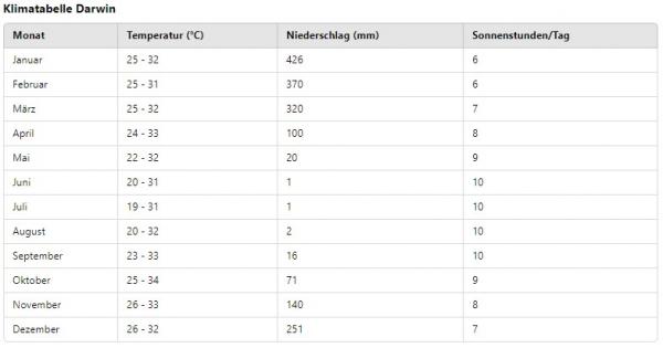 Darwin, die Hauptstadt des Northern Territory, hat ein tropisches Savannenklima mit zwei ausgeprägten Jahreszeiten: der Trockenzeit (Mai–Oktober) und der Regenzeit (November–April). Hier gibt es keine klassischen Jahreszeiten wie in Europa – stattdessen prägen Monsunregen und hohe Luftfeuchtigkeit das Wetter.